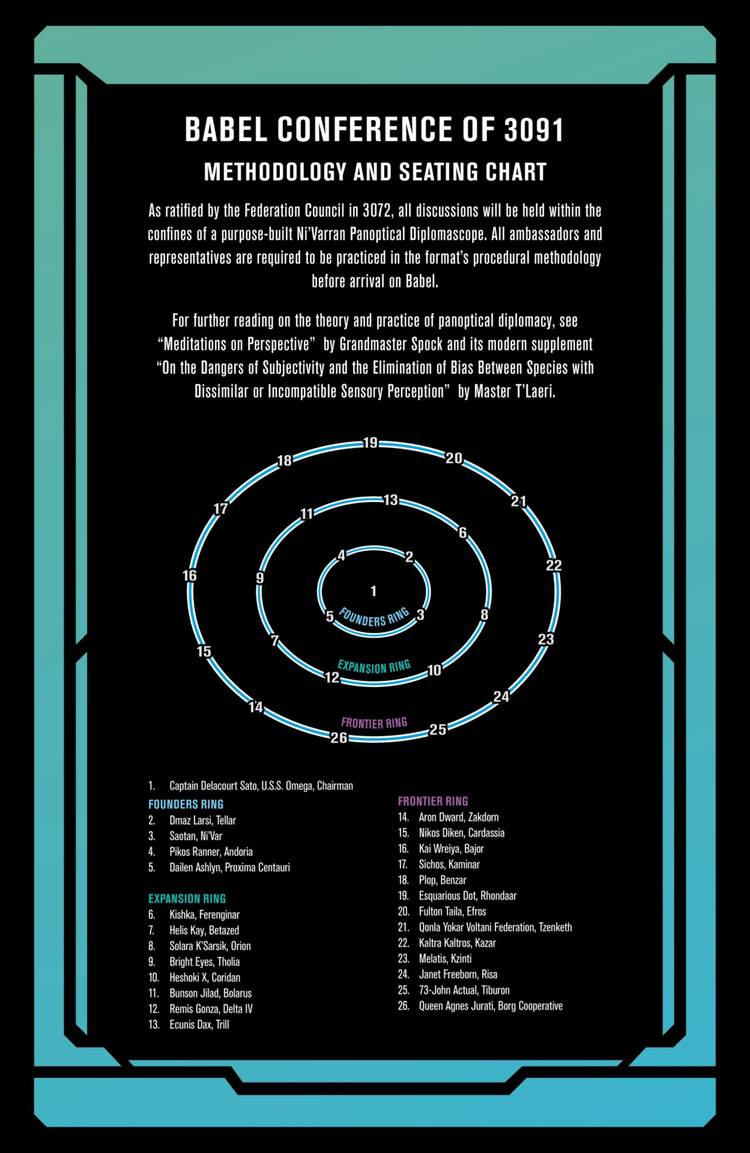 Star Trek: The Final Starship #5 was written by Collin Kelly and Jackson Lanzing and drawn by Adriann Bonilla. The Babel Convention has been known as to salvage what’s left of the Federation after the Burn. One of many delegates is Ecunis Dax, of Trill.