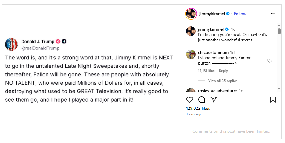 On Tuesday, Trump doubled down, posting on the unverified declare that Kimmel’s present is subsequent on the chopping block.